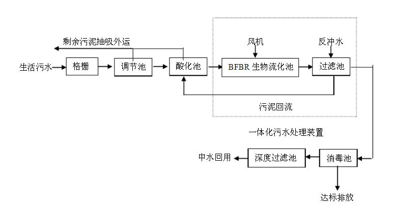 污水經(jīng)格柵后進(jìn)入調(diào)節(jié)池,進(jìn)行水力水量調(diào)節(jié),之后進(jìn)入酸化池酸化(兼有沉淀作用),然后進(jìn)入BFBR生物流化池進(jìn)行生物降解及氧化處理,并經(jīng)過(guò)濾池過(guò)濾,再經(jīng)過(guò)加氯消毒,即可達(dá)標(biāo)排放,若再經(jīng)過(guò)深度過(guò)濾處理,即可作中水回用。