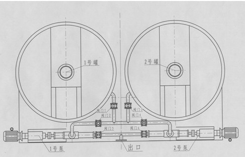 螺桿泵由六個球閥實現1#、2#攪拌罐和1#、2#螺桿泵互通。